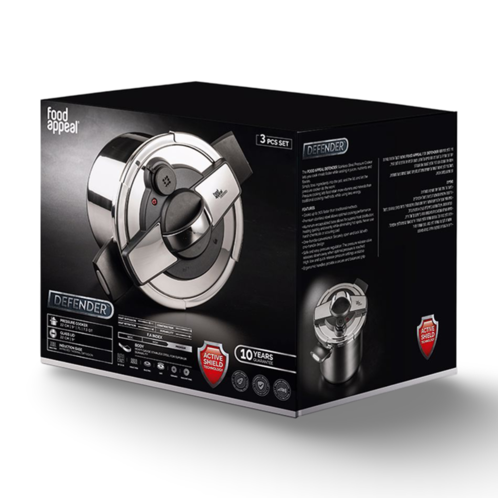 סיר הלחץ DEFENDER מבית FOOD APPEAL עם מנגנון הבטיחות בטכנולוגיית ACTIVE SHIELD מאפשר לך לבשל ארוחות מהר יותר תוך שמירה על הטעמים והערכים התזונתיים של התבשיל ושימוש בפחות אנרגיה.