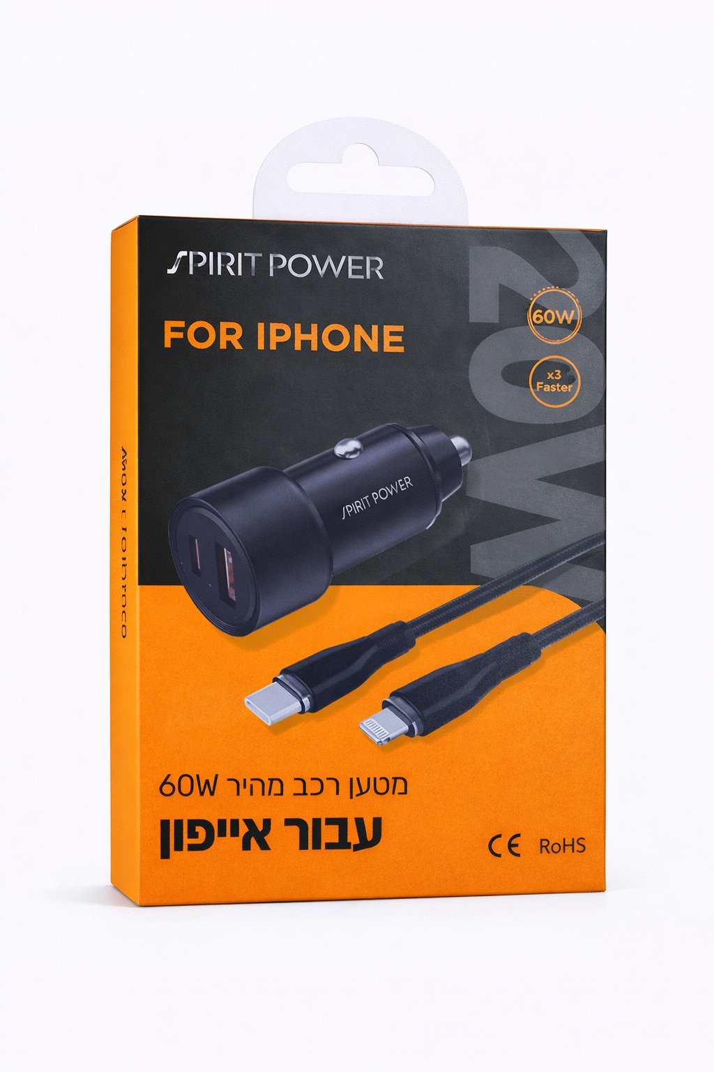 מטען רכב W60 כפול סופר מהיר+כבל אייפון PD – אריזה כתומה