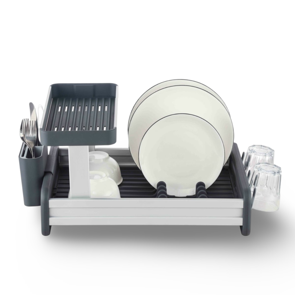 מייבש כלים קומפקטי עשוי אלומיניום עמיד, כולל מדף נוסף לייבוש מהיר ונוח במטבח.