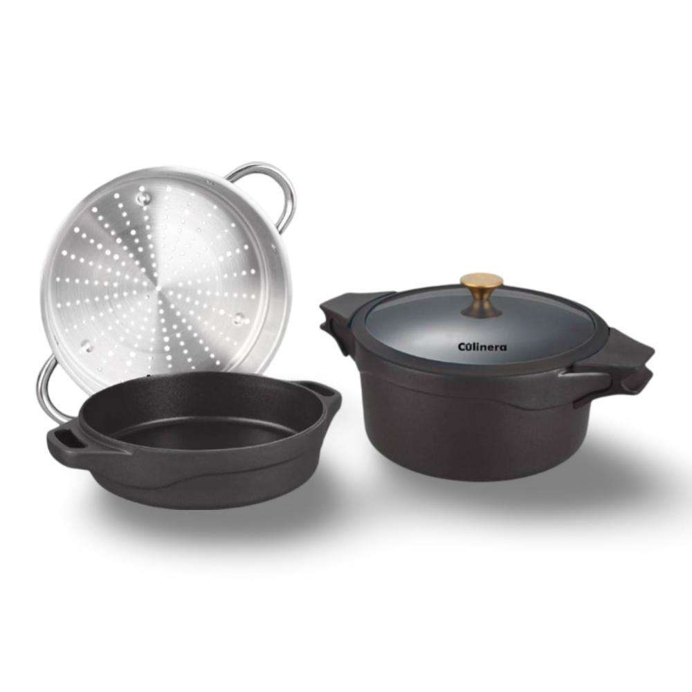 סט בישול מתקדם מיציקת אלומיניום, בעיצוב שחור עם חלוקת חום מושלמת.