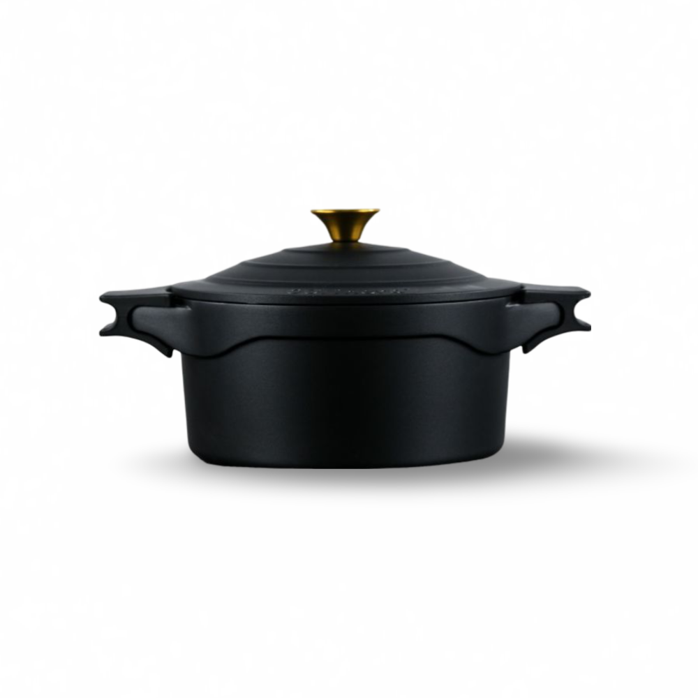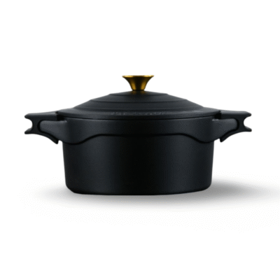 סיר קטן ואיכותי מיציקת אלומיניום בעיצוב שחור, אידיאלי למנות קטנות.