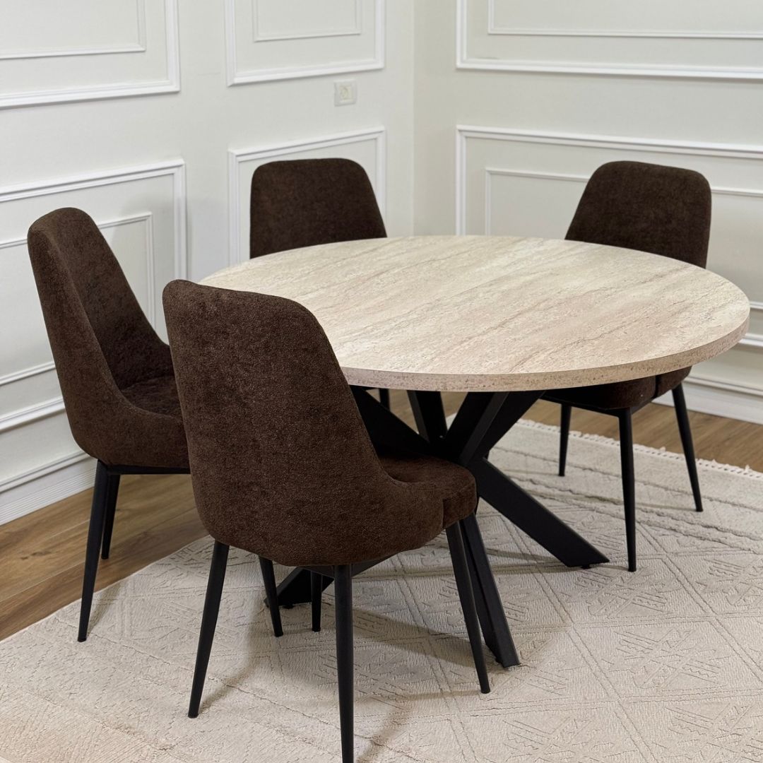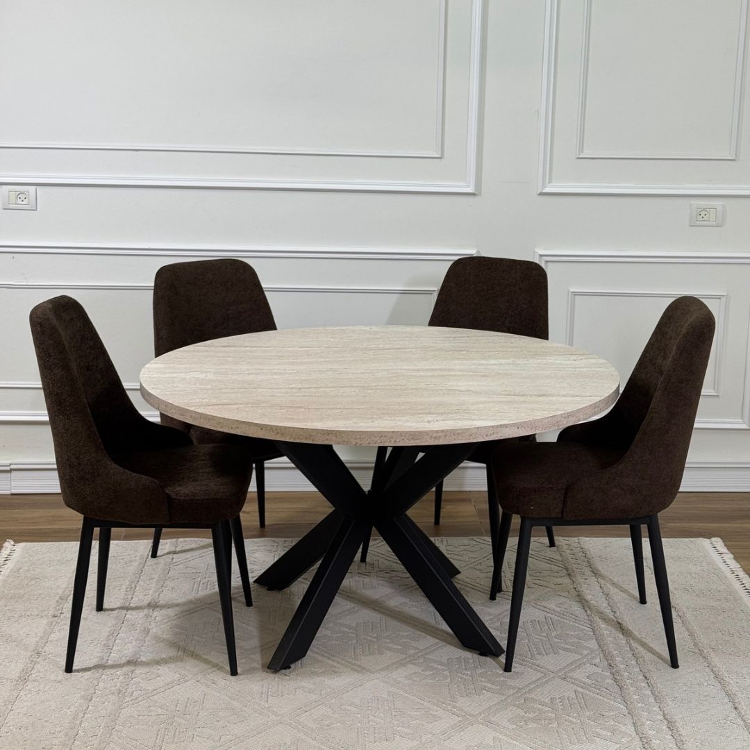 פינת אוכל עגולה בעיצוב מודרני ונועז, עם פלטה בגוון טרוורטין, עם רגלי מתכת בעיצוב X.