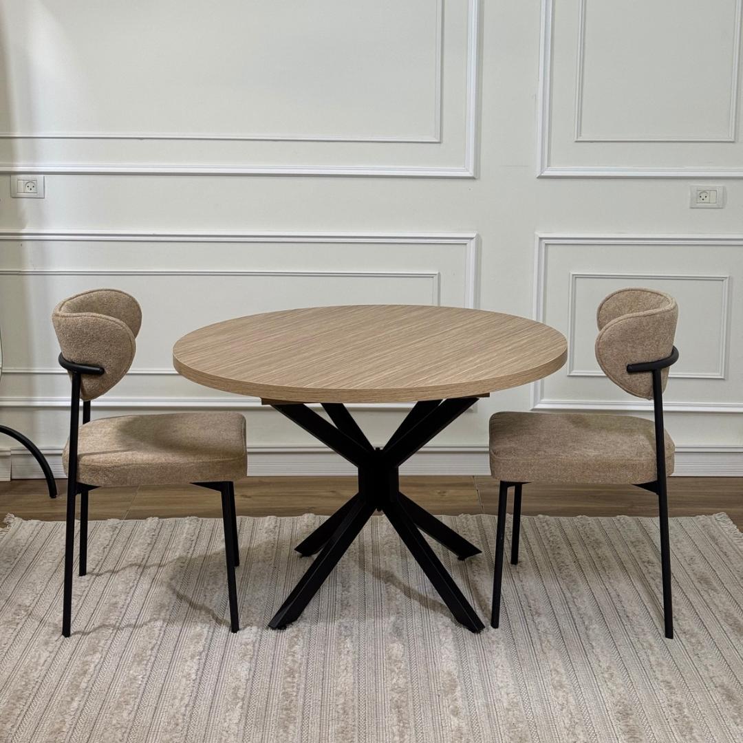 פינת אוכל עגולה בעיצוב מודרני ונועז, עם פלטה בגוון אלון, עם רגלי מתכת בעיצוב X.