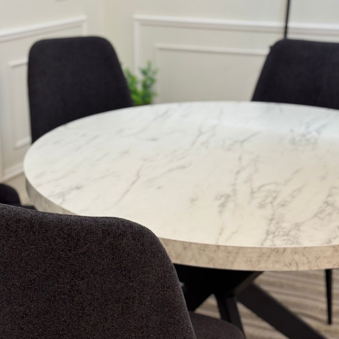 פינת אוכל עגולה בעיצוב מודרני ונועז, עם פלטה בגוון לבן שייש, עם רגלי מתכת בעיצוב X.