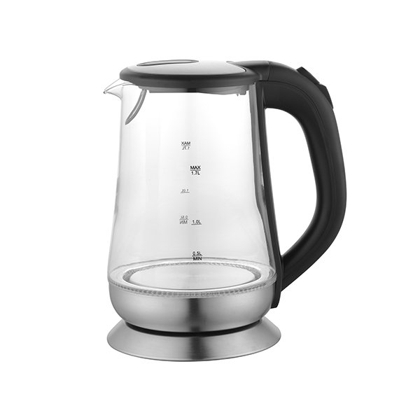קומקום חשמלי מעוצב מזכוכית עמידה לכתמים וחסינת חום. הספק 2000W תכולה 1.7 ליטר גוף חימום נסתר מנירוסטה הגנה בפני התחממות יתר והפעלה ללא מים