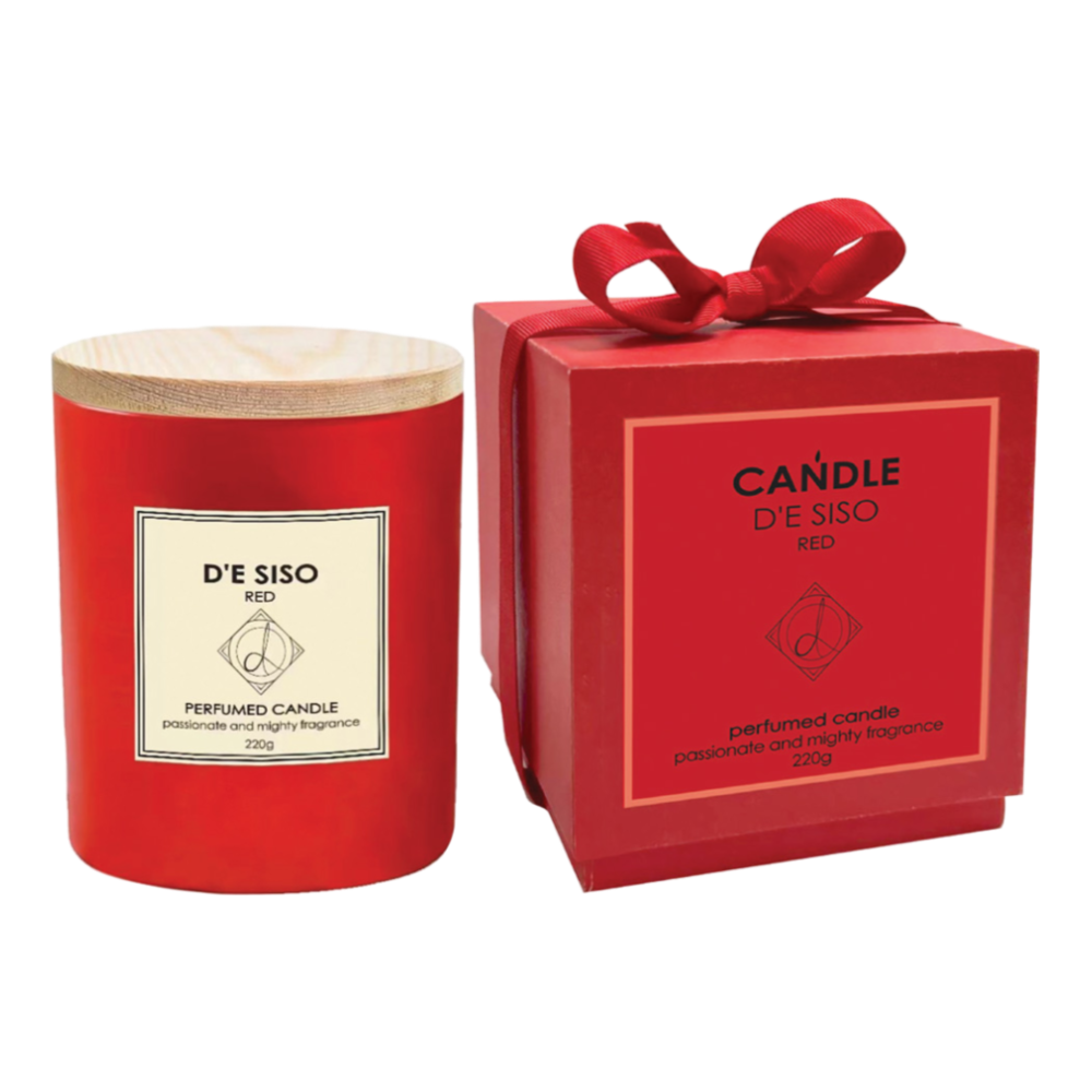 נר ריחני בצבע אדום עם ניחוח עשיר ומסעיר, המפיץ אווירה חושנית ונעימה.